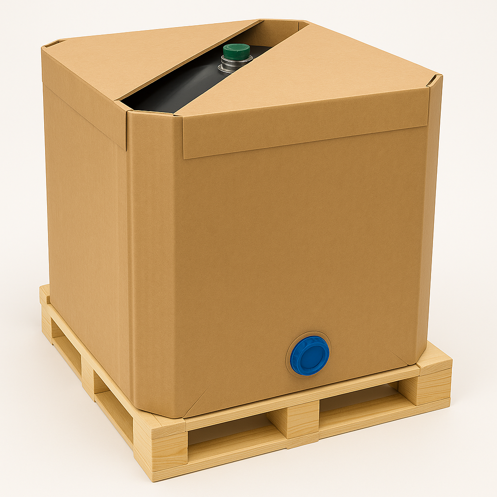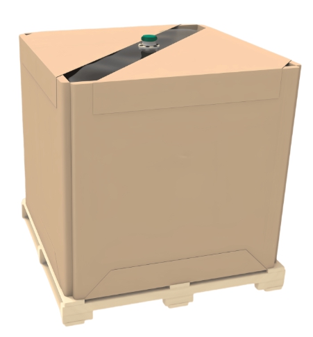 종이 IBC탱크는 골판지 외피, PE 내장 라이너, 파렛트로 구성된 조립형 액체 포장용기입니다.
